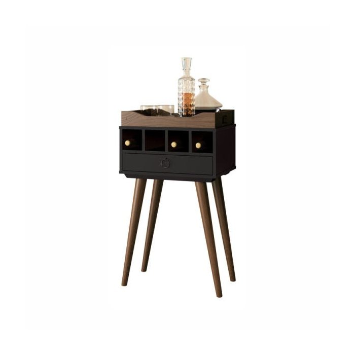 A Mesa Bar Martini possui um belo design que se adaptará muito bem em seu ambiente. Seu acabamento e pintura muito bem feitos proporcionam maior destaque a cor e conservam a beleza por muito mais tempo. Especificações Técnicas: Pés em madeira maciça; Puxadores em metal; Gavetas com corrediças metálicas; Bandeja em madeira com espelho. Medidas: Altura: 760mm Largura: 440mm Profund.: 320mm Cores: 25338 | Preto