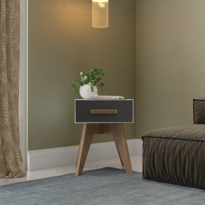 Mesa canto estilo retro com 1 gaveta nas cor off white, carvalho e grafite, completo com acessórios de montagem, pode ser usado em salas de jantar e estar, e dormitórios como mesa de cabeceira, combina com decoração clóssica.