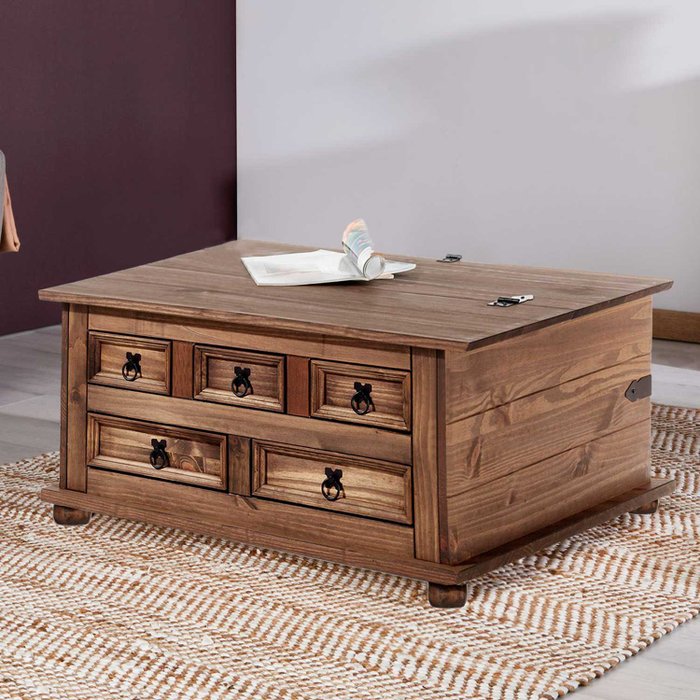 Mesa Centro Madeira Baú Organizador 5 Gavetas Rústico Tequila Cera Colonial