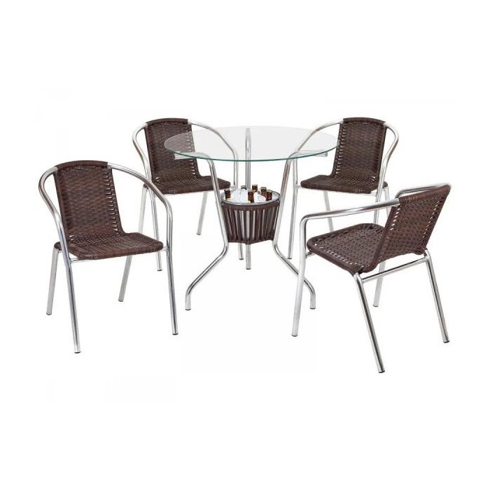 SOBRE OS PRODUTOS SARAH MÓVEIS Produtos de altíssima qualidade com design moderno, garantindo assim conforto e praticidade para seu bem-estar.Produzidos em estrutura toda em alumínio, não enferruja.Acabamento da estrutura em pintura eletrostática, não descasca ou polimento.Utilizamos Fibra Sintética e Tela Sling altamente resistente que possui proteção UV aumentando sua durabilidade, não resseca e nem desbota.Almofadas confeccionadas com tecido impermeável da linha ACQUABLOCK IMPERMEÁVEL da KARSTEN (caso o móvel possua almofada). MEDIDAS Cadeira 46x48cm Mesa 70cm de diâmetro x 70cm de altura ITENS INCLUSO 1 Base de mesa com balde de gelo 1 Vidro comum incolor de 8mm 4 Cadeiras