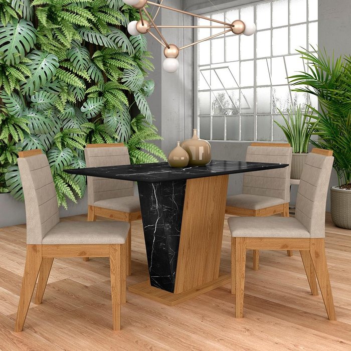 Mesa com 4 Cadeiras Qatar 1,20 Cin/carrar Preto/beg - Móveis Arapongas Cinamo/carraro Preto/bege