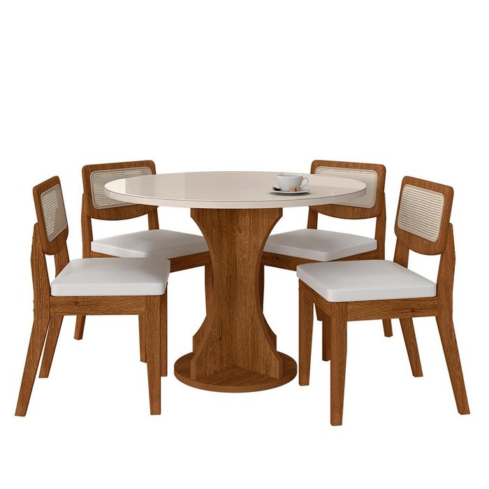 Mesa com 4 Cadeiras Redonda C/vidro Santorini Fre/off/corino Bco - M.a Freijó/off Premium/corino Off White/Branco