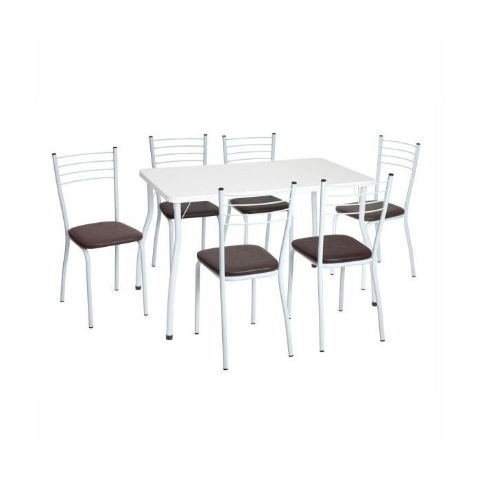 Acabamento da Cadeira/Banco: Pintura EpóxiAcabamento da Mesa: Pintura EpóxiAlmofada do assento: FixaCadeira/Banco estofada: SimCadeira/Banco suporta até: 80kgComplexidade da Montagem: Baixa: pode ser montado por uma pessoa sozinhaEspessura do Tampo: 3 mmMaterial da Base da Mesa: Aço CarbonoMaterial da Estrutura da Cadeira: Aço CarbonoMaterial do Tampo: BP BrancoMedida Mesa Montado: Alt. 0,75 x Larg. 1,17 x Prof. 0,70Medida Cadeiras Montado: Alt. 0,82 x Larg. 0,35 x 0,42Necessita Montagem: SimPossui Apoio para Braços: NãoPossui Apoio Para os Pés: NãoPossui Suporte Giratório: NãoQuantidade de Lugares: 06Revestimento da Cadeira/Banco: Material Sintético Marrom