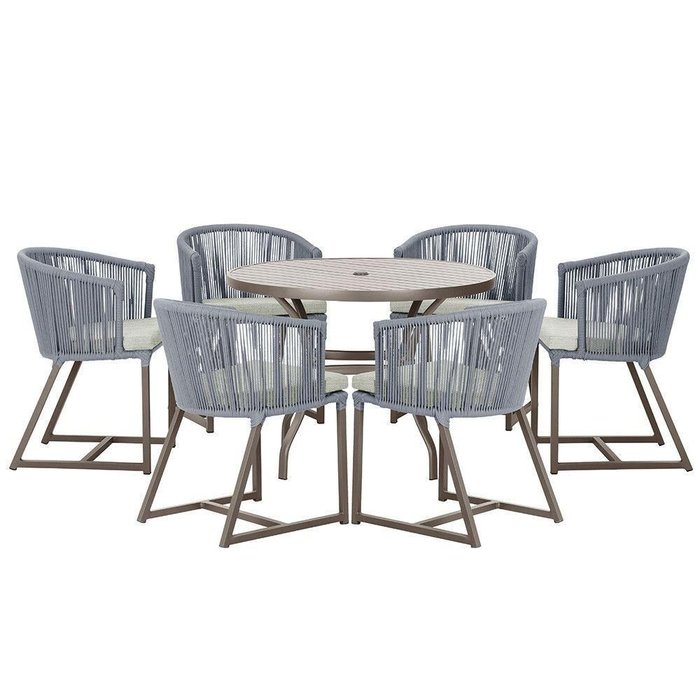Combinando estilo e resistencia, esta Mesa e cadeiras traz o melhor do design contemporaneo em aluminio com micro pintura e acabamento em corda nautica. O Estofado impermeavel completa o conforto e a funcionalidade, tornando-a ideal para ambientes externos e internos.