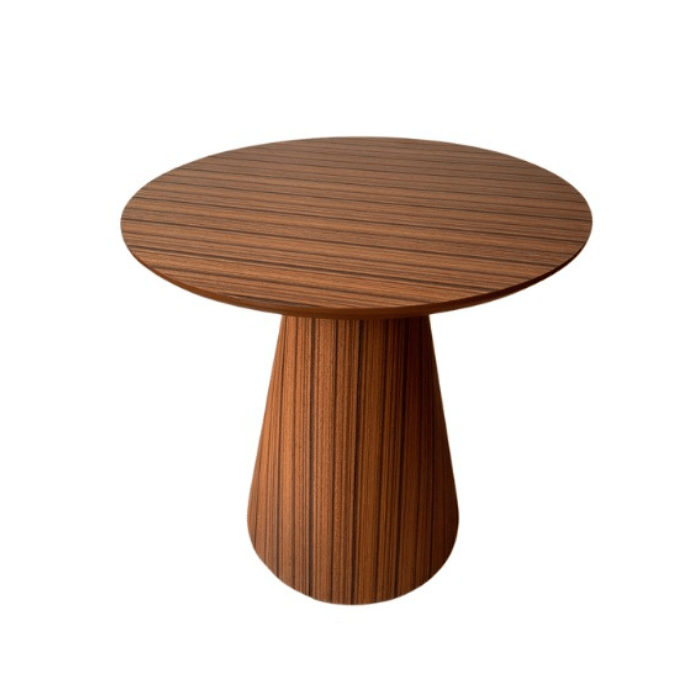 Mesa Lateral Cone Redonda, Tampo 41 cm em MDF Laminado em Madeira Natural Pau Ferro Linear, Base estruturada em MDF Flexivel e acabamento em Lamina de Madeira Natural Pau Ferro Linear.