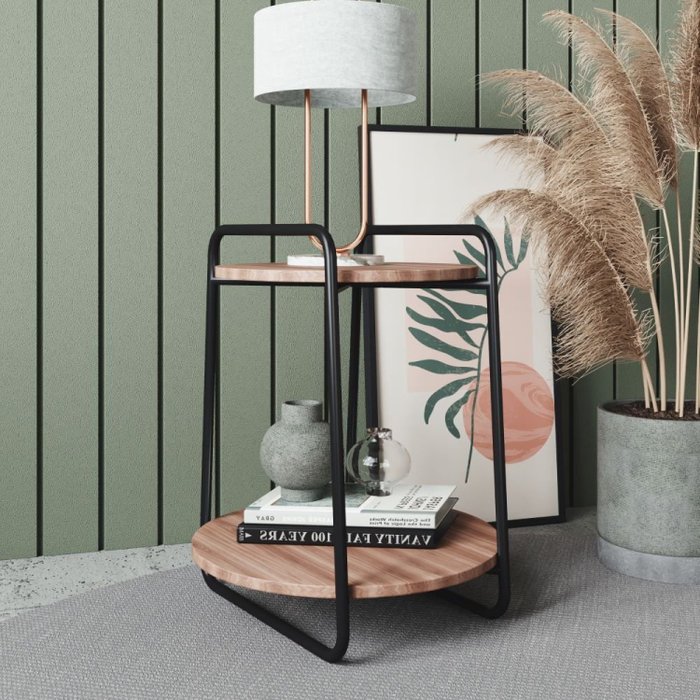 Mesa de Apoio Menor Redonda em Tubos de Aço Carbono Pintado e Tampo de Madeira em MDP Tube Pozza Móveis Preto/Castanho