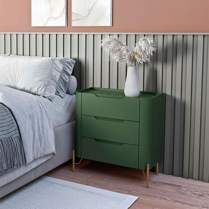 Mesa de Cabeceira 3 Gavetas 70cm MDF Musgo com Dourado