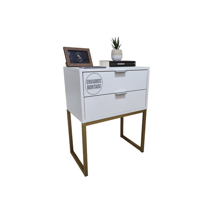 Mesa de Cabeceira Branca 50cm 2 Gavetas Mdf Quarto Cama Eco - Base Dourada - Puxador Prata-(montado)