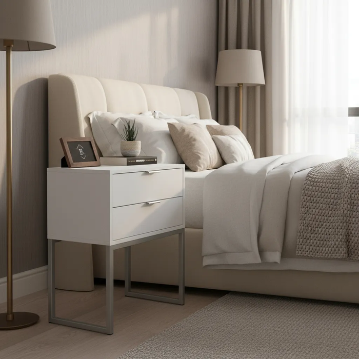 Com 2 gavetas equipadas com corrediças telescópicas e estrutura metálica reforçada, ela garante estilo, resistência e funcionalidade para o seu quarto.