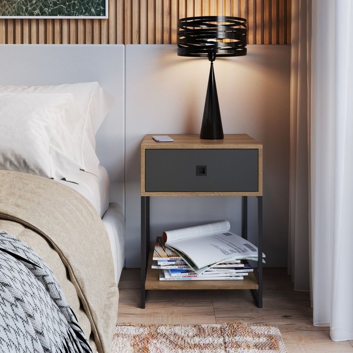 Mesa de cabeceira estilo industrial feita de metal e madeira. Fácil montagem, acabamento profissional e dois tons para escolher qual melhor combina com sua decoração. Moderno, este produto possui puxador de furo com proteção para os dedos, gaveta para guardar seus itens pessoais e uma ampla prateleira na parte de baixo para livros e decorações.