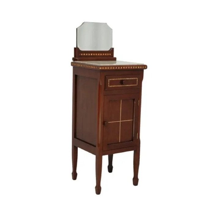 Mesa de Cabeceira clássico em madeira maciça, possui uma gaveta pequena e um compartimento para alocação de bens, detalhes em marchetaria, possui características, dimensões, acabamento e qualidade de alto padrão, são fiéis aos traços originais dos modelos fabricados na França para a corte do Rei Luiz VX em 1750, possuem estrutura em madeira nobre maciça e bactericida.