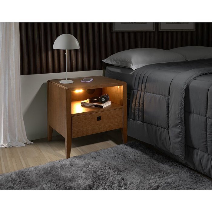 Com apenas uma entrada de energia, você tem luz de cabeceira, carregamento de celular por indução, carregamento via cabo e ainda pode ouvir música. Muito mais praticidade e organização para o seu dia a dia: