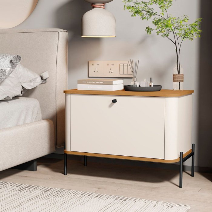 Mesa de Cabeceira Curva 1 Gaveta Pés e Puxadores em Metal 45cm Tucupí Off White/Nature/Preto