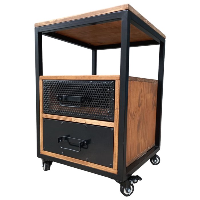 Mesa de Cabeceira Industrial de Ferro Preto e Madeira Cor Imbuia com 2 Gavetas e 4 Rodízios