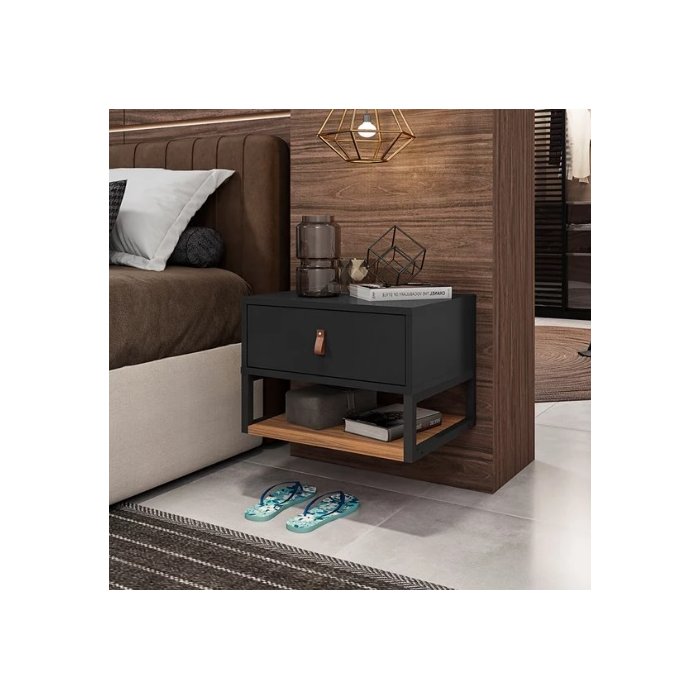 Mesa de Cabeceira Industrial Suspensa Quarto Organizadora Multiuso 1 Gaveta com Puxador em Couro Sig Preto