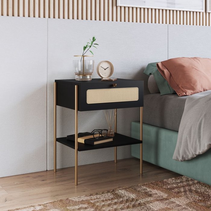 Mesa de Cabeceira Jocasta 1 Gaveta Palhinha Pés Metálicos Asn 28932 Boho Naturart Nero/Dourado