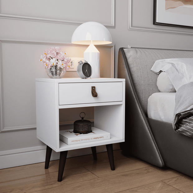 A Mesa de Cabeceira Ravenna conta com design compacto e sofisticado, com puxador em couro, se adaptando a diversos estilos de quarto agregando muita delicadeza.. Conta com uma ampla gaveta para acomodar diversos itens do dia a dia que precisamos manter a sempre a mão, e uma prateleira e nicho para decorar da maneira que preferir. Seu tampo ergonômico permite dispor relógio, celular, livro e etc.