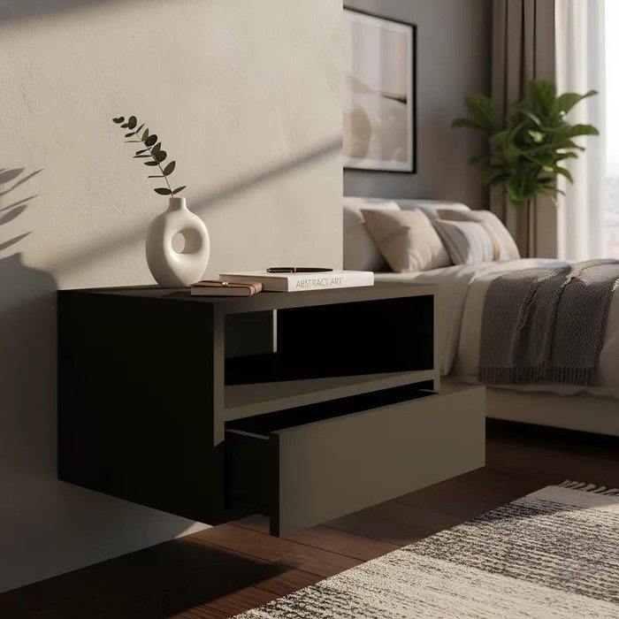 Mesa de Cabeceira Nicho com Gaveteiro Suspenso de Parede Preto Laca