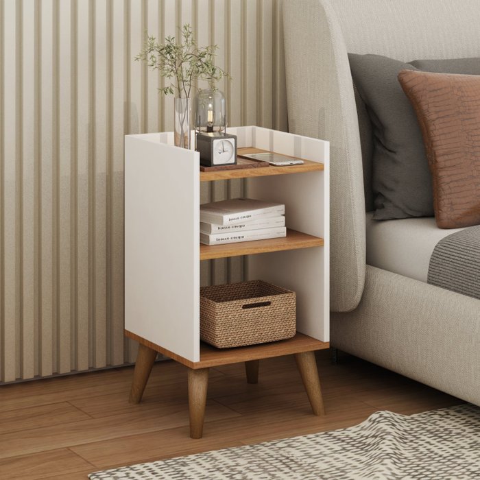 Mesa de Cabeceira Retrô com Pés Palito em Madeira Maciça Prateleiras e Borda Superior
