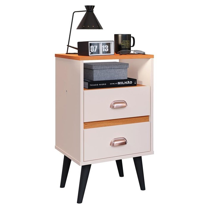 Mesa de Cabeceira Retrô Mesinha Pequena Canto Quarto Apoio Cama 2 Gavetas Nicho Off/Cinamomo-RPM