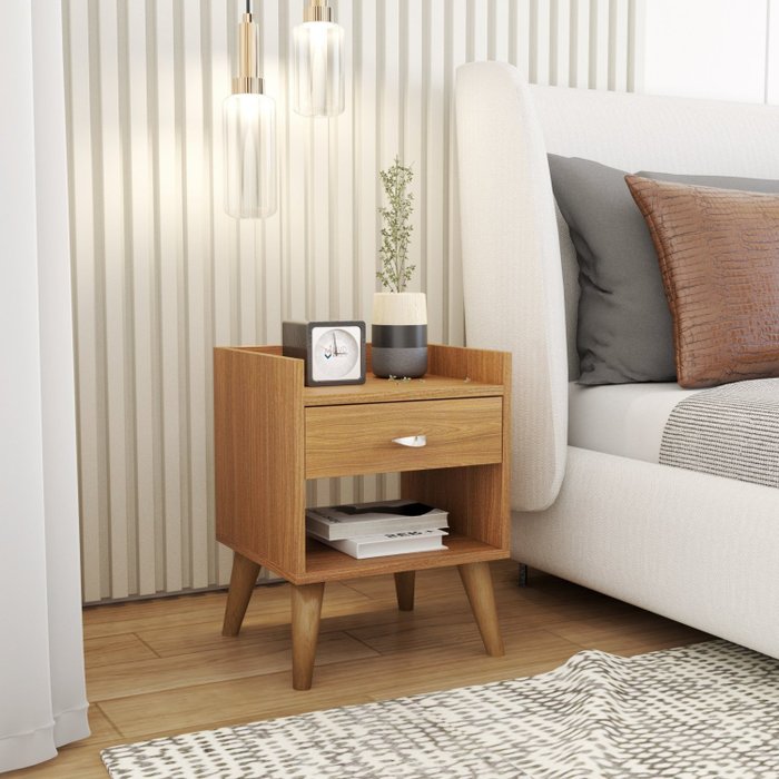 Com pés em madeira maciça estilo retrô, esta Mesa de Cabeceira é perfeita para as laterais da sua cama. Possui duas gavetas com amplo espaço interno e puxadores cromados.