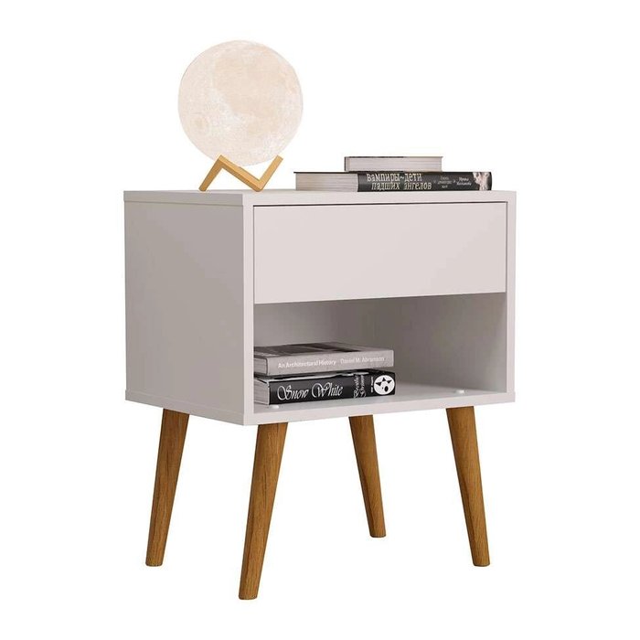 Mesa de Cabeceira Retrô Villare Branco/Madeirado 01 Gaveta 01 Nicho e 04 Pés Palito - Robel Móveis