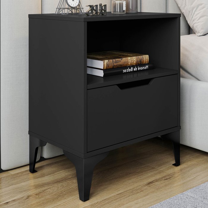 Mesa de Cabeceira Vegas 1 Gaveta com Nicho Base de Aço Design Moderno - Preto/pé Preto