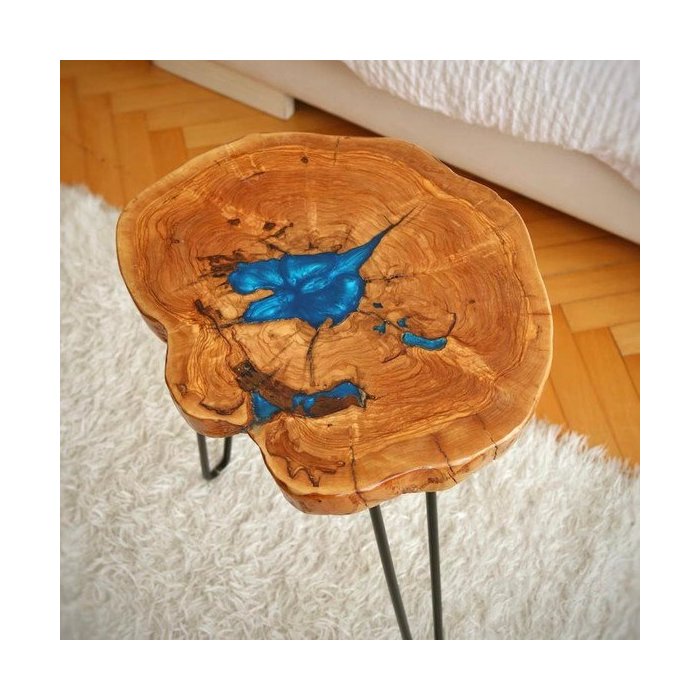 Mesa de Canto Luxo Rústica em Madeira e Resina Azul NATURAL DA MADEIRA COM RESINA AZUL NO CENTRO