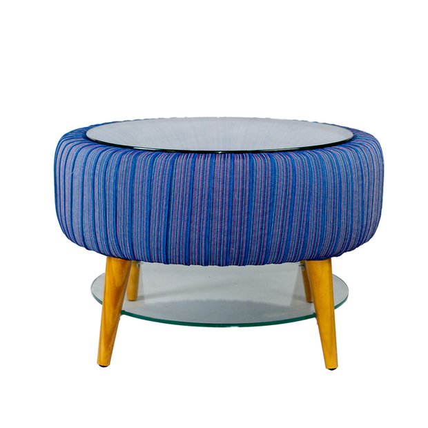 Produzida manualmente, com base em pneu revestido, tampo de vidro e uma base inferior feito especialmente para revistas.