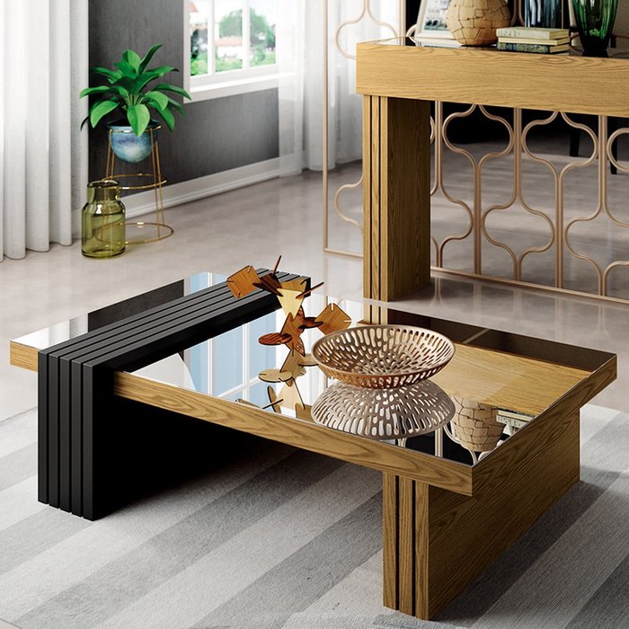 Mesa de Centro com Espelho Riad Decorativa Sala de Estar Carvalho Intense/Preto G26 - Gran Belo