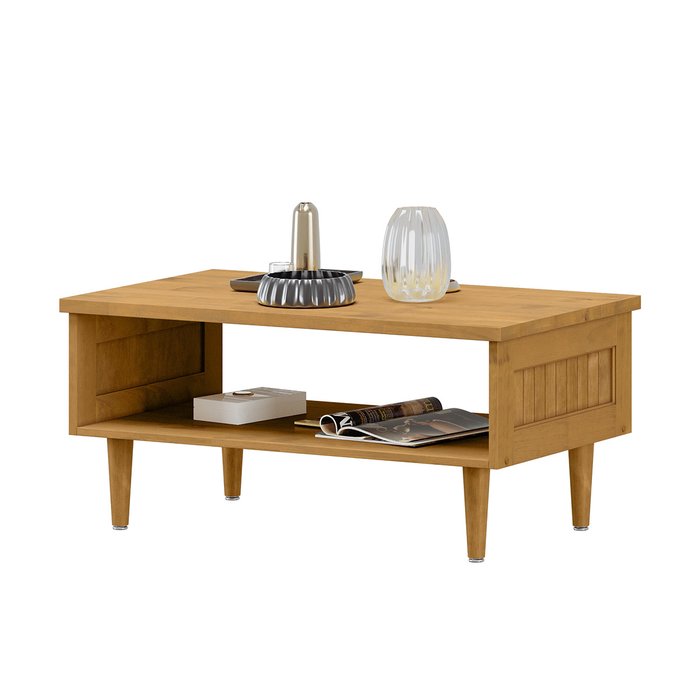 Mesa de Centro ROMA com estrutura em Madeira de Pinus Reflorestada, acabamento feito em Poliuretano (PU) FOSCO, que preserva as características da madeira e garante uma ótima conservação e durabilidade do produto. Laterais com detalhe no estilo ripado Europeu.