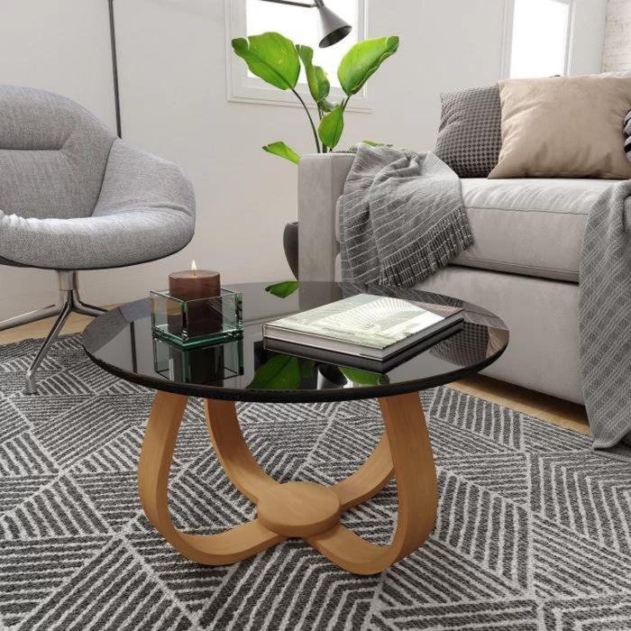 Confeccionada com materiais de qualidade, o tampo é em MDF com acabamento laqueado em sua parte inferior e com um vidro de alta qualidade em sua parte superior. Os pés são de eucalipto, o que faz com que sua durabilidade seja longa.