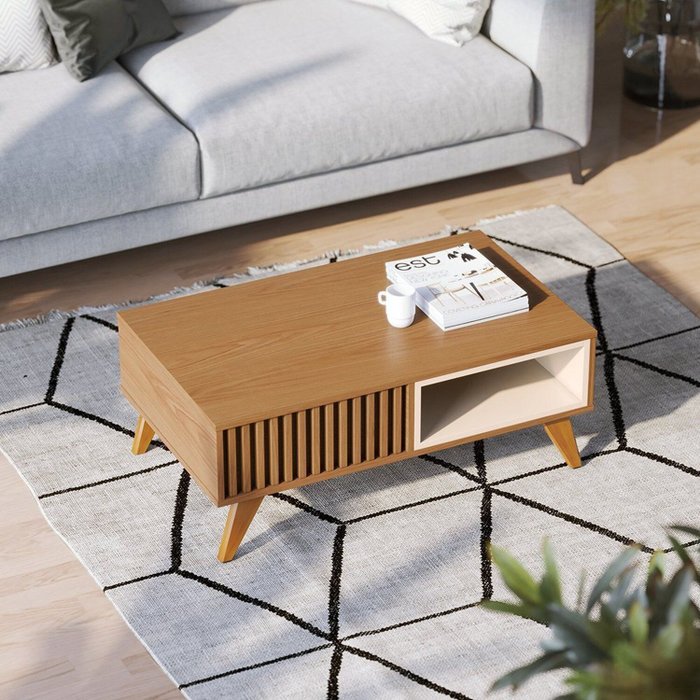 Inspirada no estilo retrô, a mesa de centro Jeri é um móvel prático e funcional. Ideal para compor diversos espaços da casa, como sala de estar, sala de tv ou até mesmo em salas de espera de ambientes de escritório, servindo como apoio para revistas, vasos e demais objetos decorativos. Pode ser usada de ambos os lados, pois possui o design simétrico com nichos internos em cada lado e pés em madeira maciça.