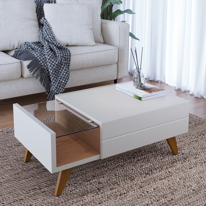 Mesa de Centro Retangular com Vidro Pés Madeira Maciça Noronha Off White/Freijó