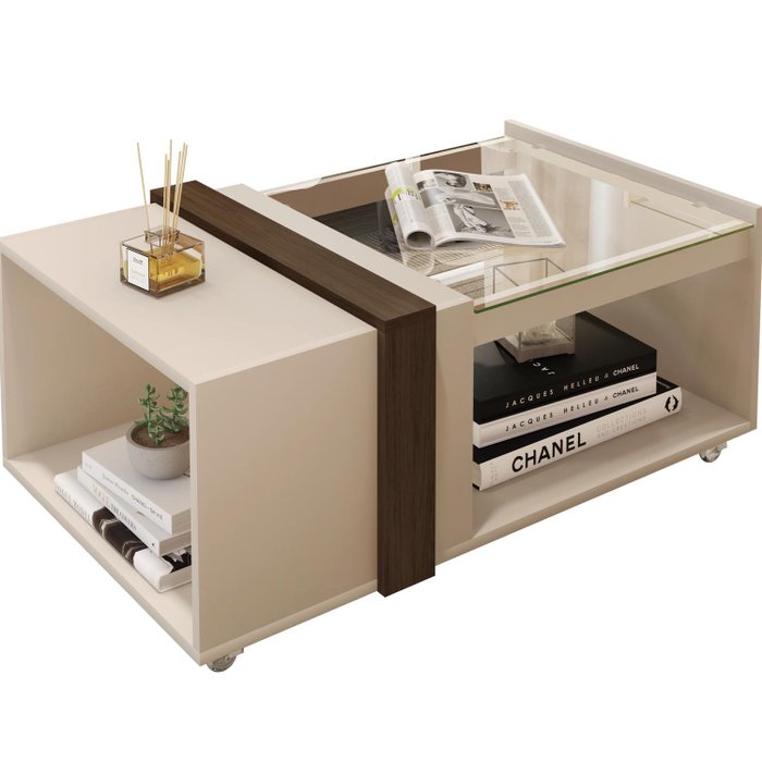 Mesa de Centro Sala Tampo Vidro Detalhes Moderno Rodízios:off White-havana Off White-Havana
