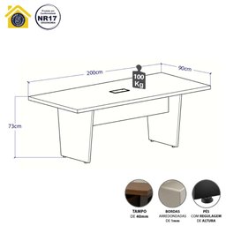 | Especificações | Tampo engrossado em MDP 40 mm, Suporte de até 80kg, 1 caixa de tomada, Calha berço para organização de fiação, Pés painel angular em V |