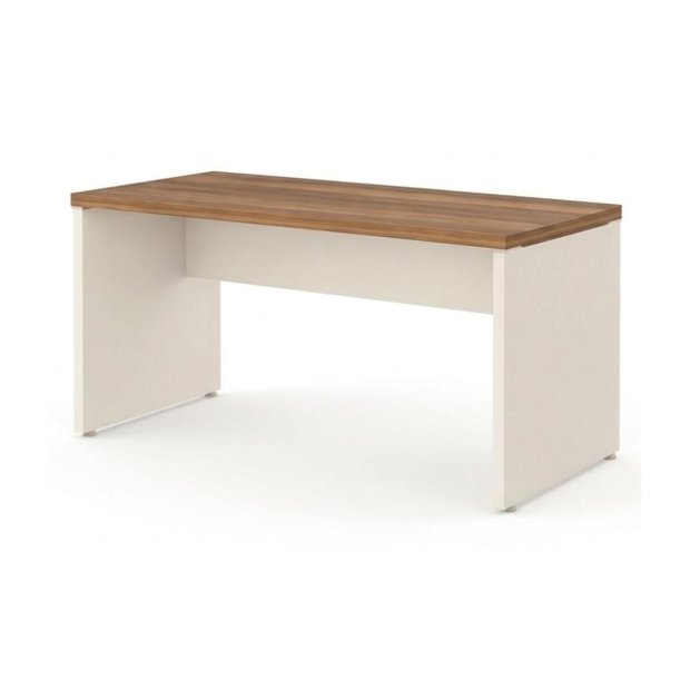 As laterais (pés painel) em 25mm garantem a sustentação necessária com um visual equilibrado, enquanto a combinação de cores — tampo amadeirado escuro nogal sevilha e base em tom champanhe claríssimo — traz modernidade ao ambiente de trabalho.