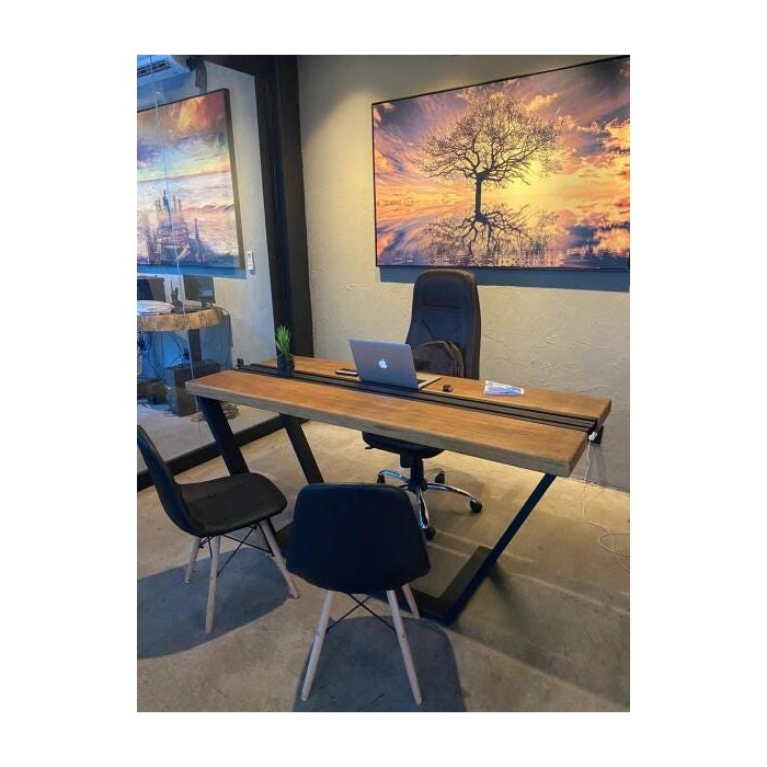 Mesa de madeira maciça pequiá, com design atual e moderno que remete ao conceito industrial de decoração um móvel com múltiplas funções que pode deixar seu Escritório repaginado e mais organizado. A sua estrutura é feita em ferro com pintura eletrostática.