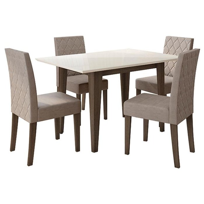 Mesa de Jantar 136cm Kate com Vidro Amêndoa Off White com 4 Cadeiras Jade Bordada Amêndoa Cappuccino