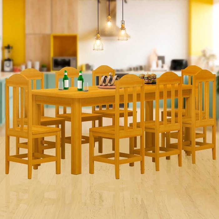 Dimensões da mesa: Largura 200cm; Altura 81cm; Comprimento 88cm.Dimensões da Cadeira: Largura 41,3 cm; Comprimento 38,5 cm; Altura 105 cm.Material: Madeira MaciçaItens Inclusos: 1 mesa e 8 cadeiras- 100% madeira maciça- Design clássico e robusto- Combina com qualquer tipo de ambienteRecomendações de uso, manutenção e limpeza: Limpar com flanela ou pano macio seco, não utilizar produtos abrasivos, desengordurantes, álcool ou solvente. Não expor o produto diretamente a luz solar e à umidadeGarantia: 3 meses