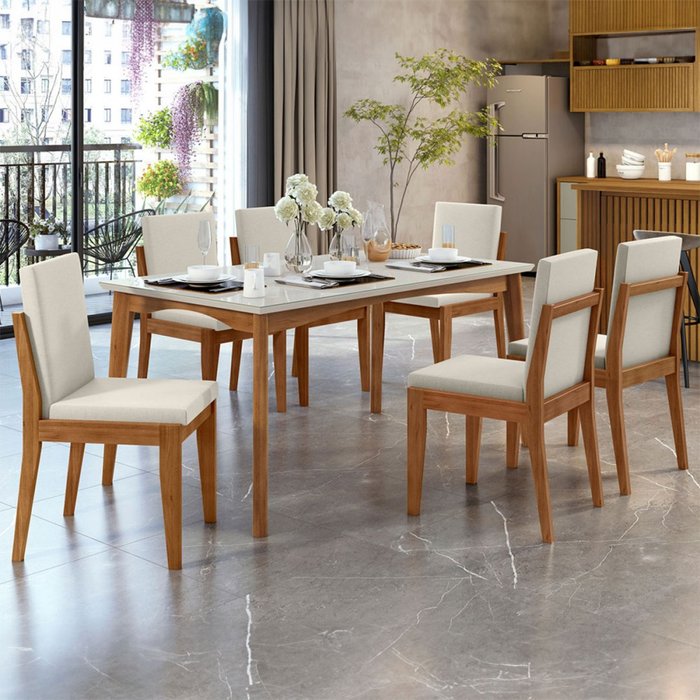 Mesa de Jantar 6 Lugares Monalisa Lady com Vidro Mel Natural/off White - Nesher