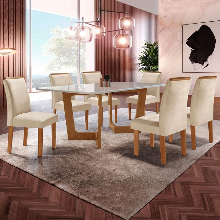 O(a) Mesa de Jantar 6 Lugares Nápoles/Luísa com Vidro Cinamomo/Off White/Bege - Cel Móveis é produzido em MDF na escala de brilho Fosco, e possui um grau de dificuldade de montagem: Médio.