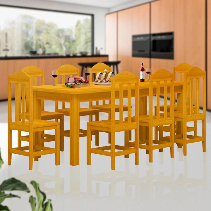 Dimensões da mesa: Largura 200cm; Altura 81cm; Comprimento 88cm.Dimensões da Cadeira: Largura 41,3 cm; Comprimento 38,5 cm; Altura 105 cm.Material: Madeira MaciçaItens Inclusos: 1 mesa e 8 cadeiras- 100% madeira maciça- Design clássico e robusto- Combina com qualquer tipo de ambienteRecomendações de uso, manutenção e limpeza: Limpar com flanela ou pano macio seco, não utilizar produtos abrasivos, desengordurantes, álcool ou solvente. Não expor o produto diretamente a luz solar e à umidadeGarantia: 3 meses