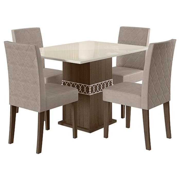 Mesa de Jantar 90cm com Vidro Amêndoa Off White com 4 Cadeiras Jade Bordada Amêndoa Cappuccino – Pol
