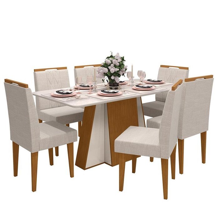 Mesa de Jantar Amalfi com 6 Cadeiras Creta Tauari/Off White/Champagne - Lukaliam Móveis Tauari/Off White/Champagne