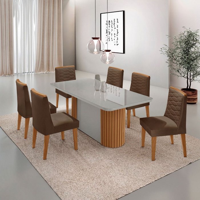 Mesa de Jantar Aspen 180cm Tampo Mdf Vidro Canto Copo com 6 Cadeiras Eloise Moderna Mobília Veludo Marrom/Off White/Naturale