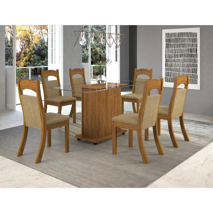 Além do mais, sua mesa possui formato retangular com tampo de vidro, as cadeiras dispõem de espuma macia, em seus encostos e assentos, e revestimento em tecido para assegurar um toque muito mais suave.