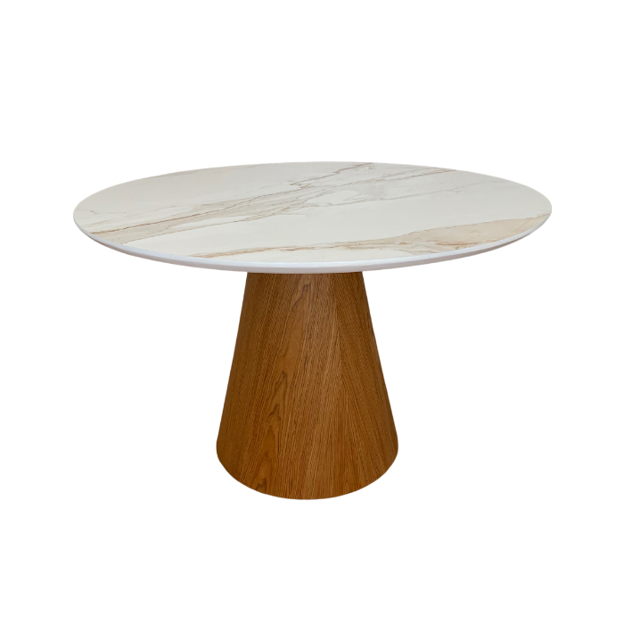 Mesa de Jantar Cone 90 cm Tampo Cerâmica Esmaltada Calacatta Base Freijó Personal Decor Mesa de Jant
