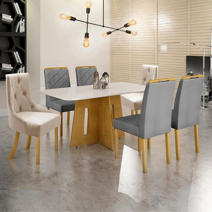 Mesa de Jantar Dasala Paloma com 4 Cadeiras Viana e 2 Cadeiras Megam em Veludo Cinza com Bege