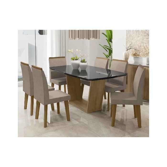 Mesa de Jantar Diamante com 6 Cadeiras Cinamomo Black com Pena Caramelo Pés Oblongo - RV Móveis